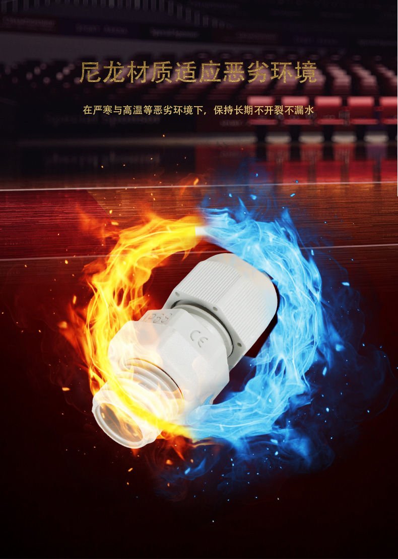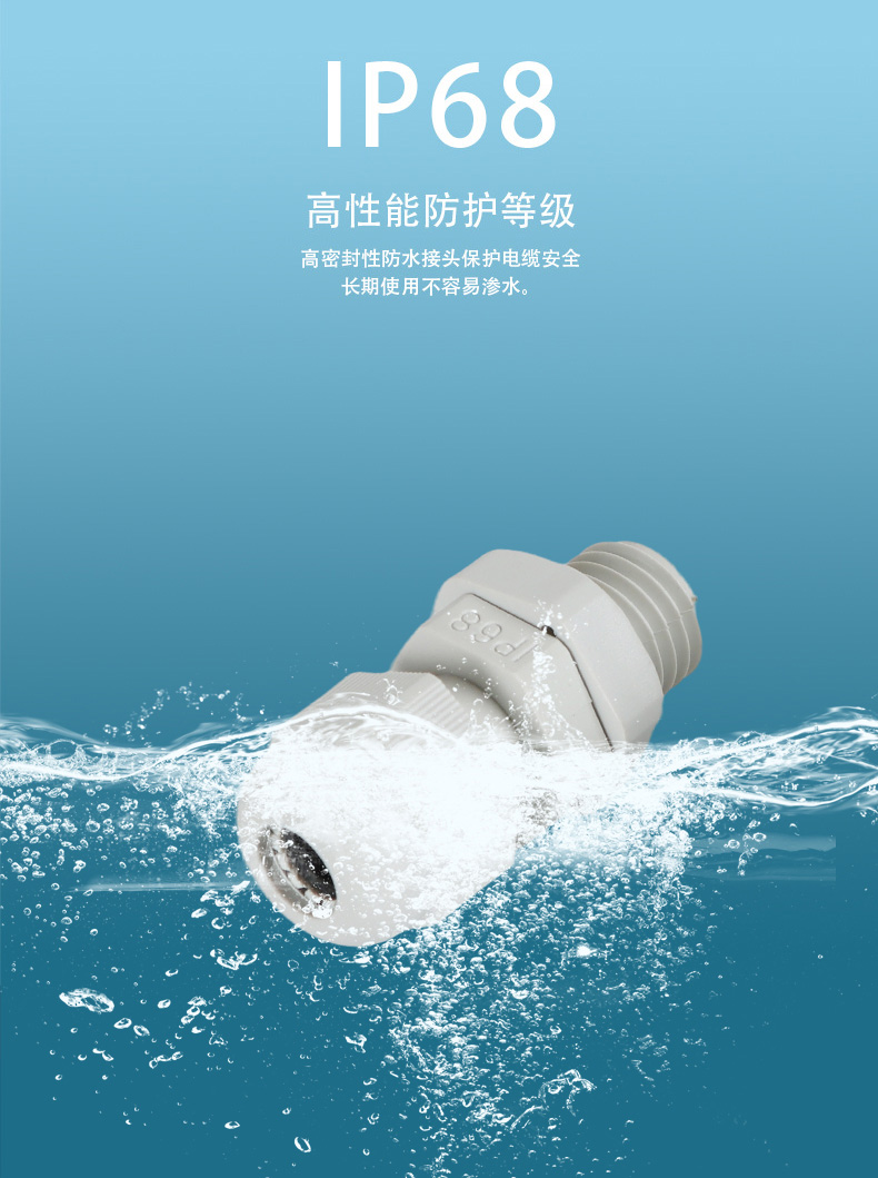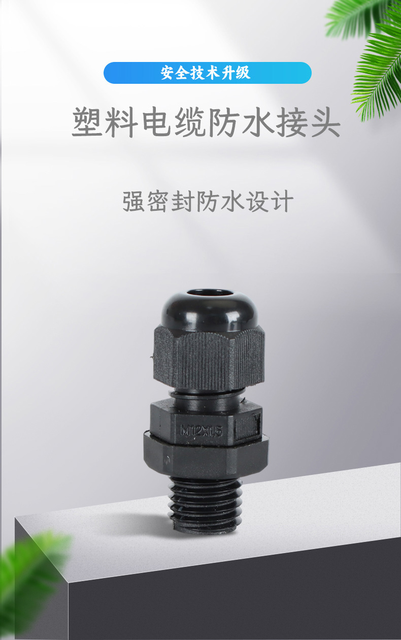 尼龍材質適用惡劣環境紅、灰、黑、深灰、白、藍 六種顏色常規:黑、灰兩種顏色,其它顏色需要定做在嚴寒與高溫等惡劣環境下,保持長期不開裂不漏水高密封性防水接頭保護電纜安全,長期使用不容易滲水