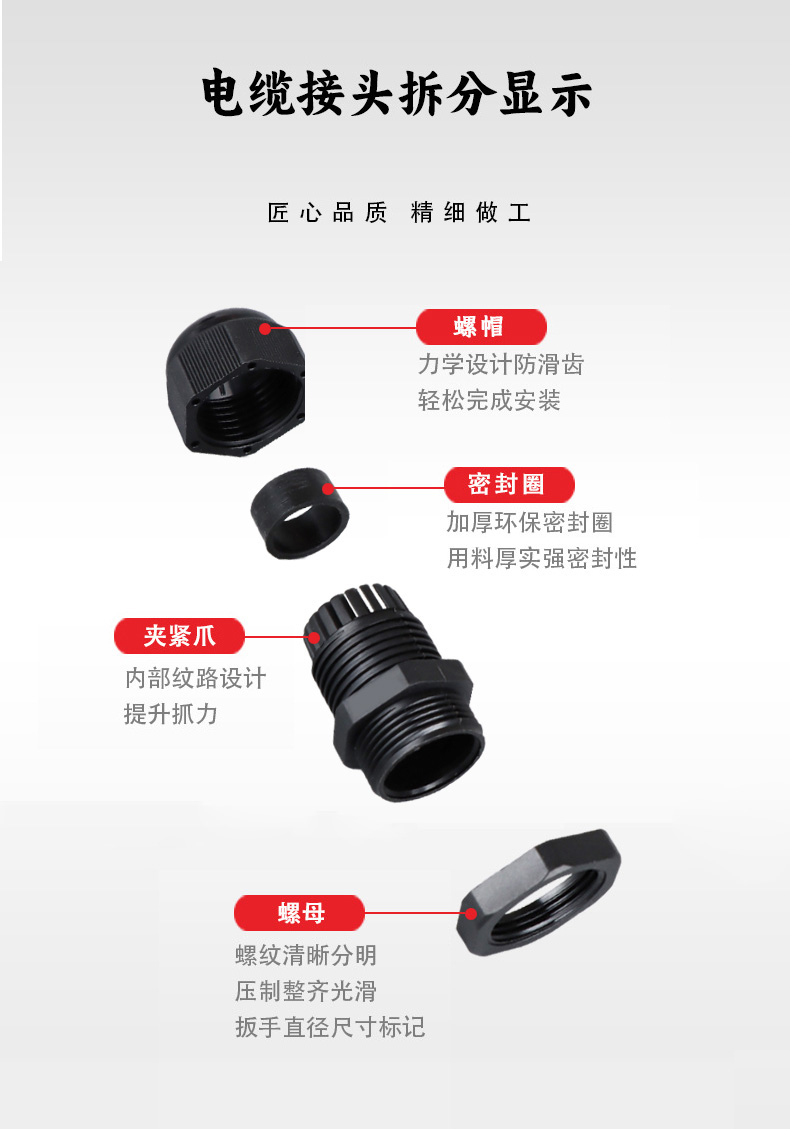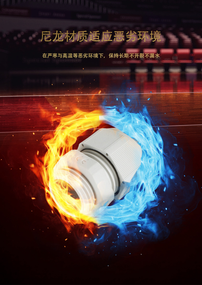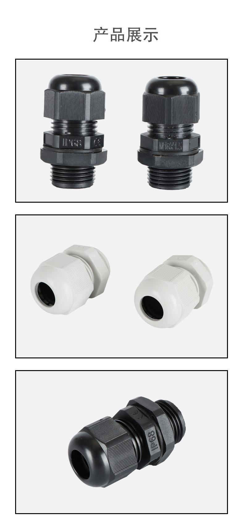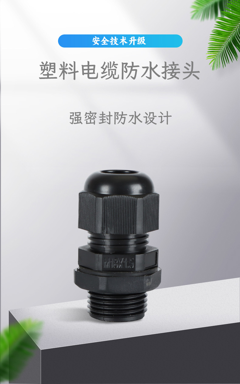 尼龍材質(zhì)適用惡劣環(huán)境紅、灰、黑、深灰、白、藍(lán) 六種顏色常規(guī):黑、灰兩種顏色,其它顏色需要定做在嚴(yán)寒與高溫等惡劣環(huán)境下,保持長期不開裂不漏水高密封性防水接頭保護(hù)電纜安全,長期使用不容易滲水