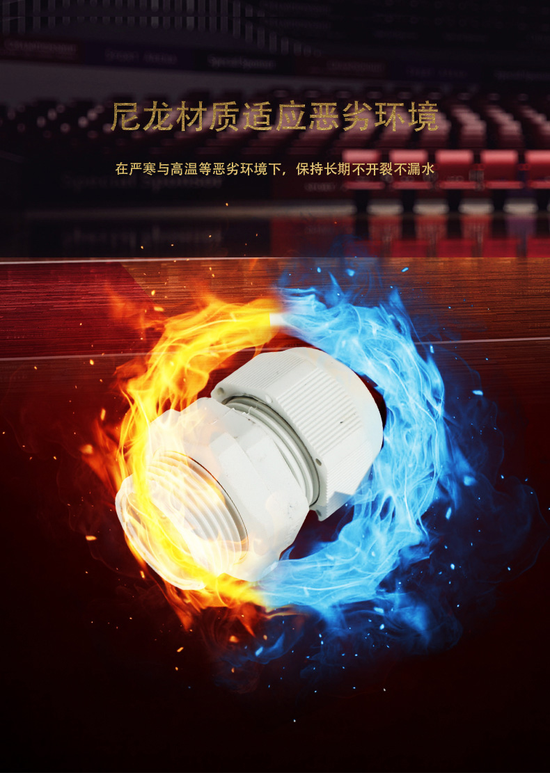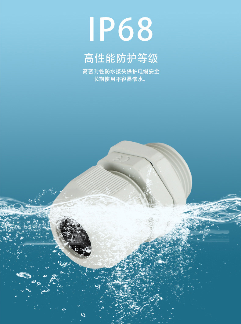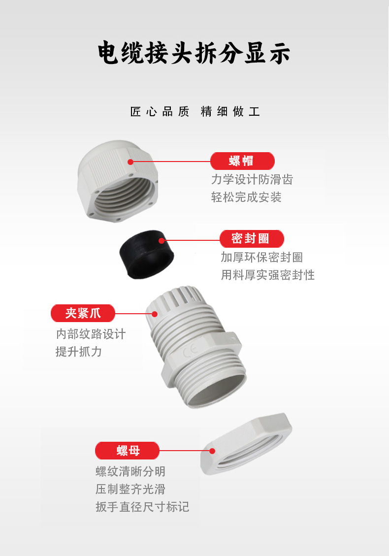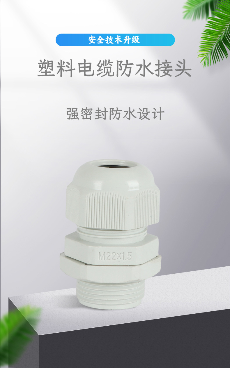 尼龍材質適用惡劣環境紅、灰、黑、深灰、白、藍 六種顏色常規:黑、灰兩種顏色,其它顏色需要定做在嚴寒與高溫等惡劣環境下,保持長期不開裂不漏水高密封性防水接頭保護電纜安全,長期使用不容易滲水