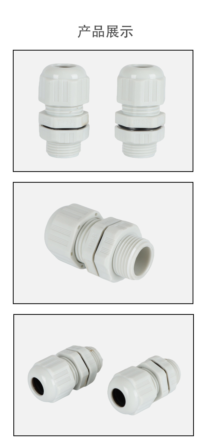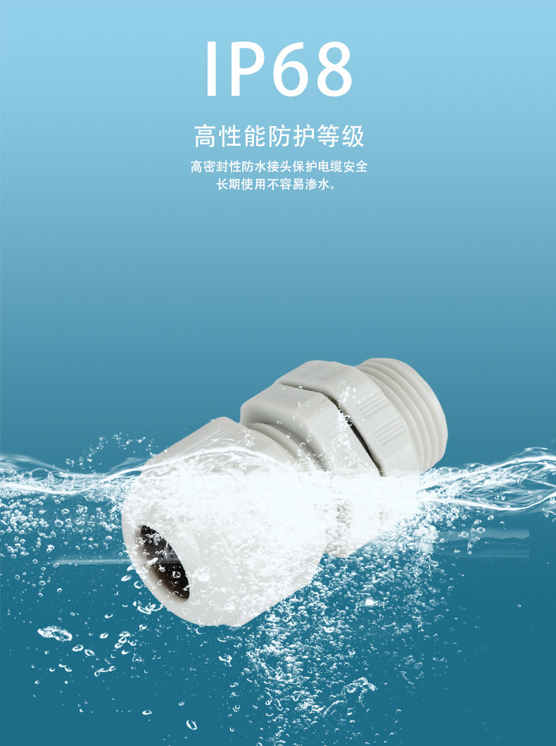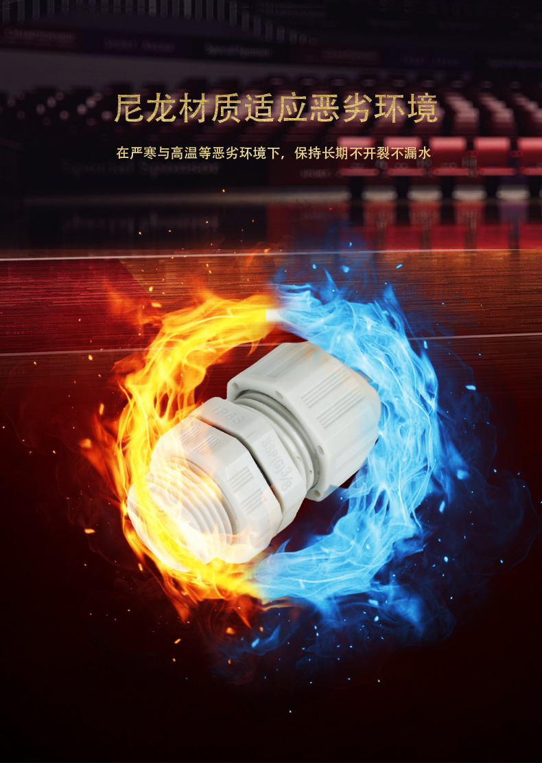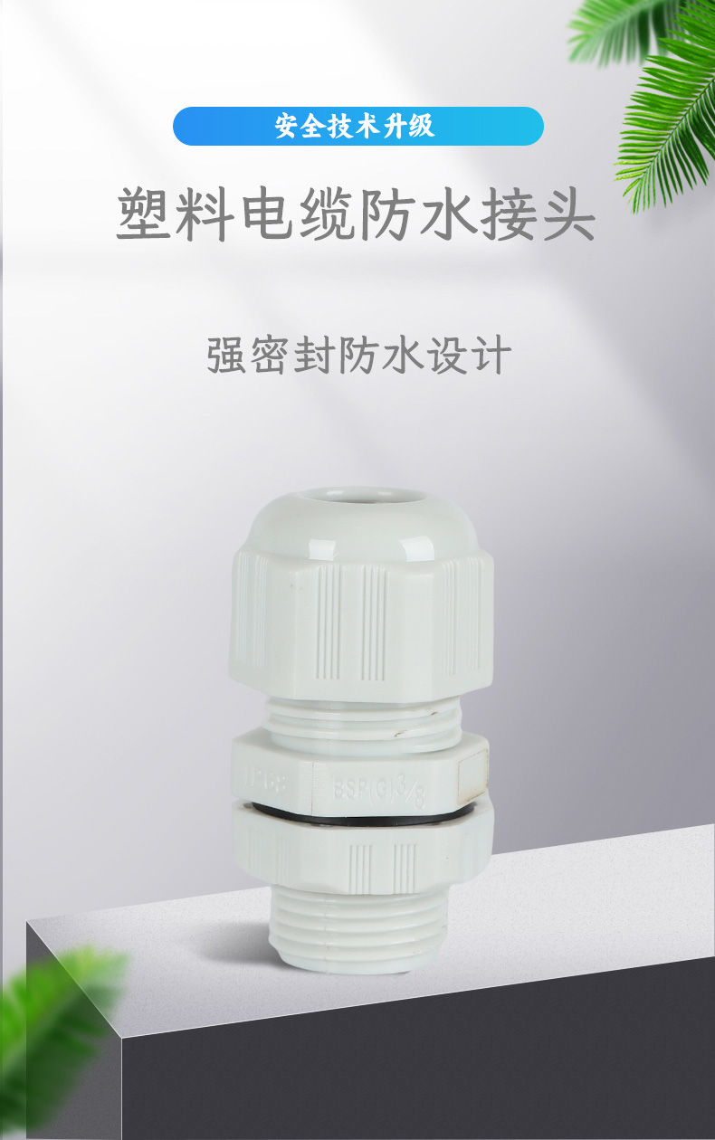 尼龍材質適用惡劣環境紅、灰、黑、深灰、白、藍 六種顏色常規:黑、灰兩種顏色,其它顏色需要定做在嚴寒與高溫等惡劣環境下,保持長期不開裂不漏水高密封性防水接頭保護電纜安全,長期使用不容易滲水