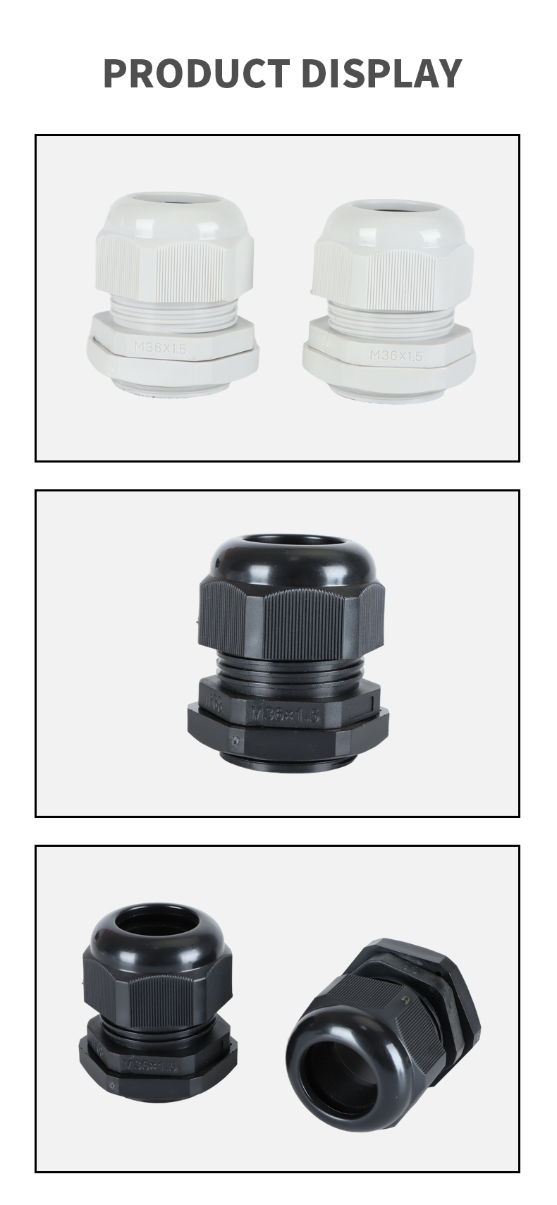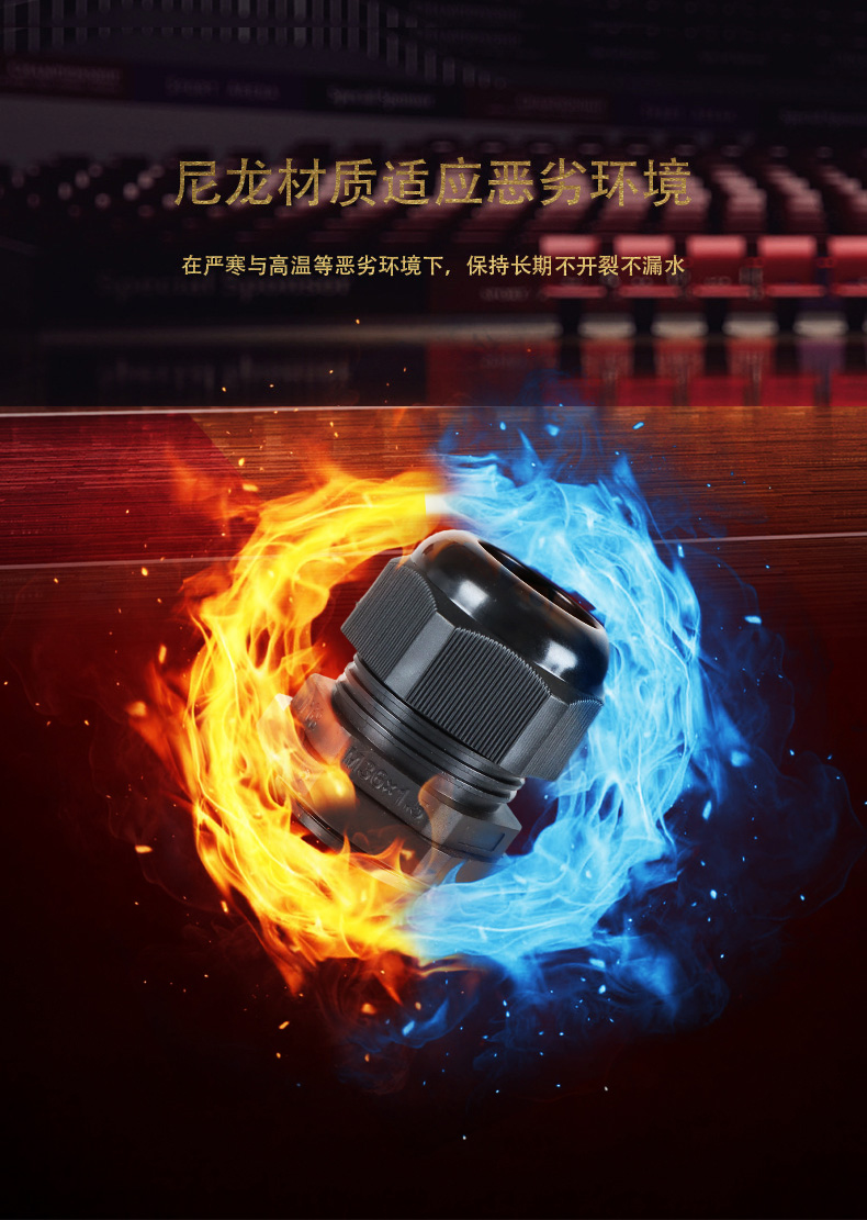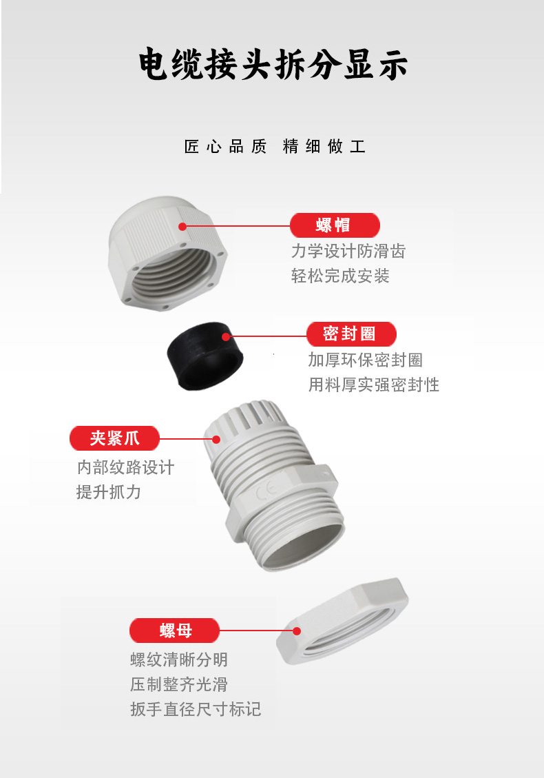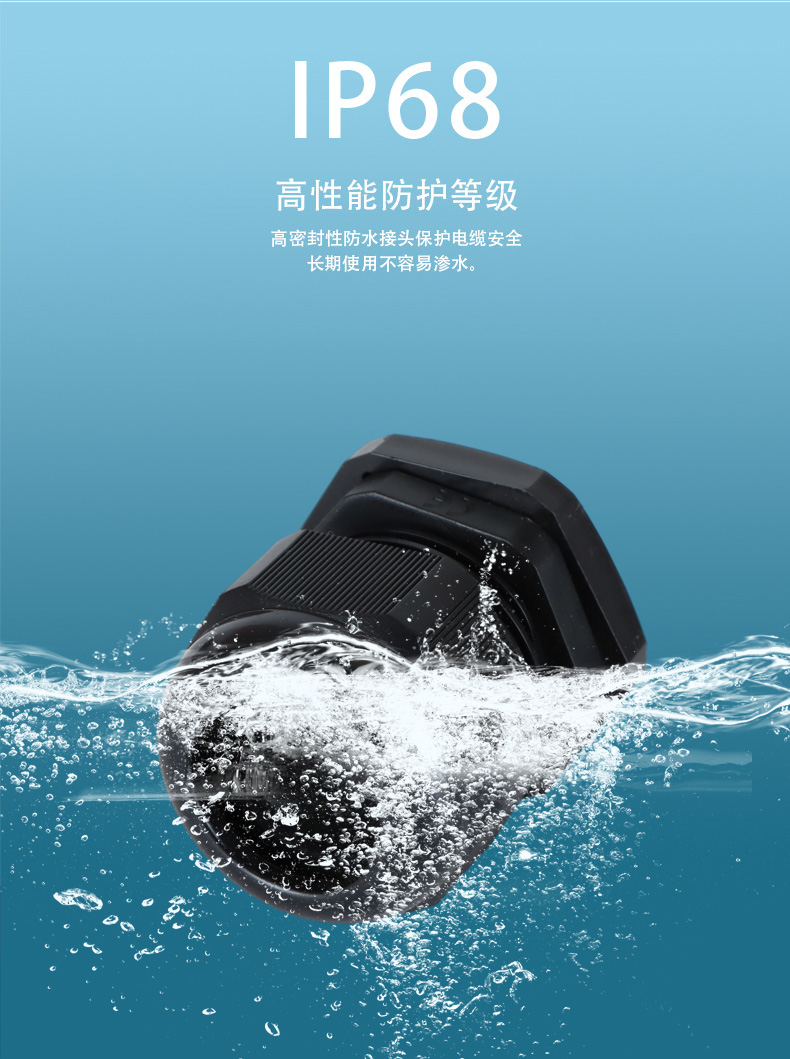 尼龍材質適用惡劣環境紅、灰、黑、深灰、白、藍 六種顏色常規:黑、灰兩種顏色,其它顏色需要定做在嚴寒與高溫等惡劣環境下,保持長期不開裂不漏水高密封性防水接頭保護電纜安全,長期使用不容易滲水