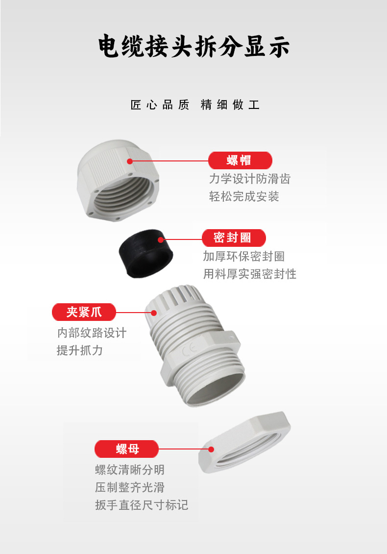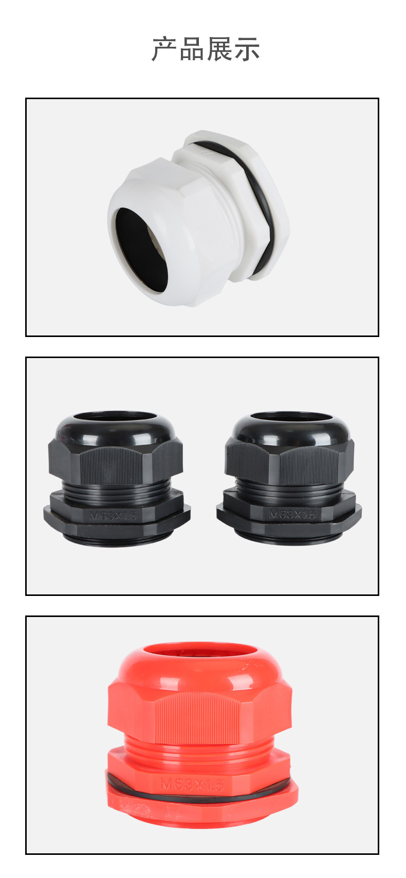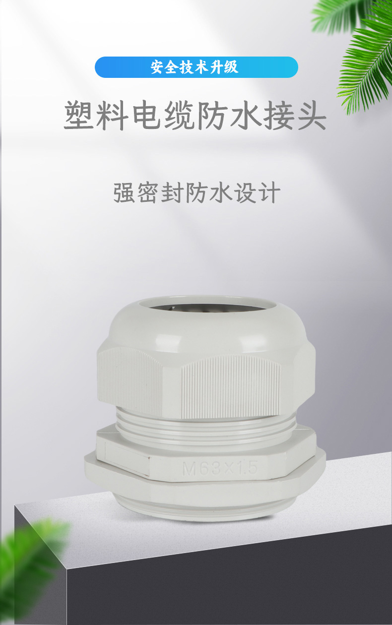 尼龍材質(zhì)適用惡劣環(huán)境紅、灰、黑、深灰、白、藍(lán) 六種顏色常規(guī):黑、灰兩種顏色,其它顏色需要定做在嚴(yán)寒與高溫等惡劣環(huán)境下,保持長(zhǎng)期不開裂不漏水高密封性防水接頭保護(hù)電纜安全,長(zhǎng)期使用不容易滲水