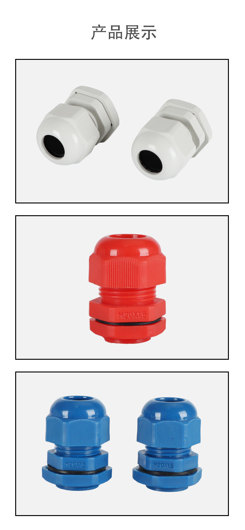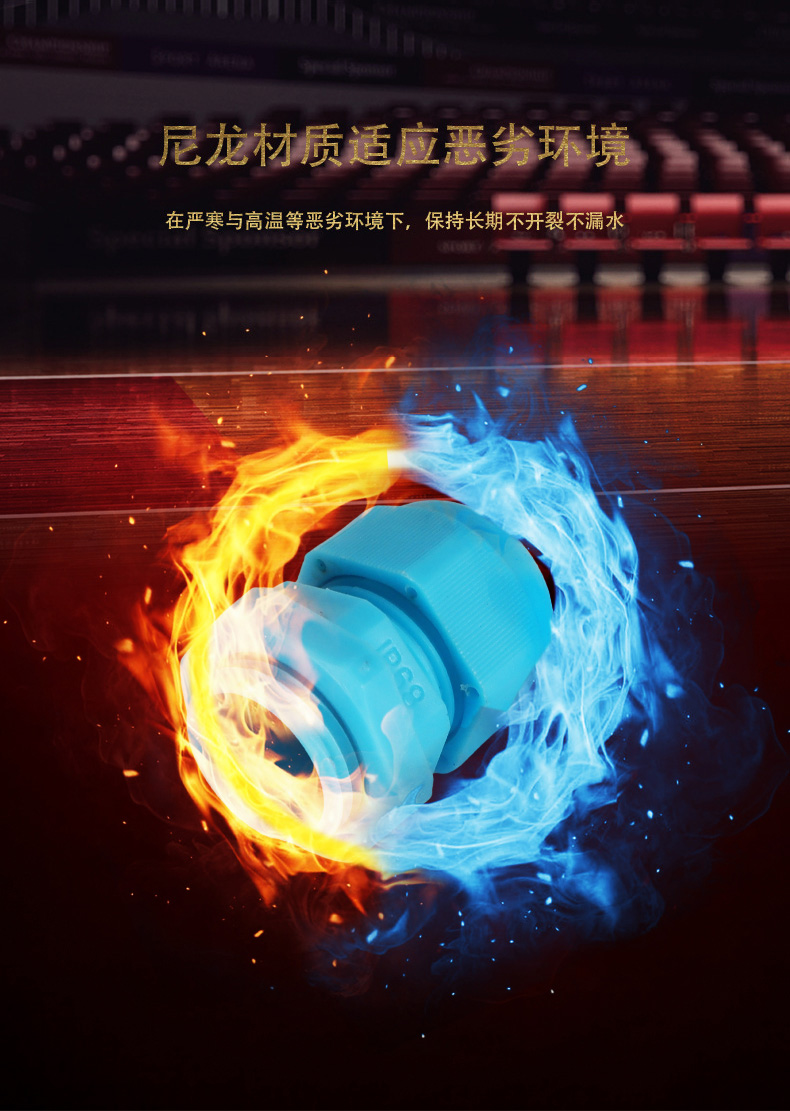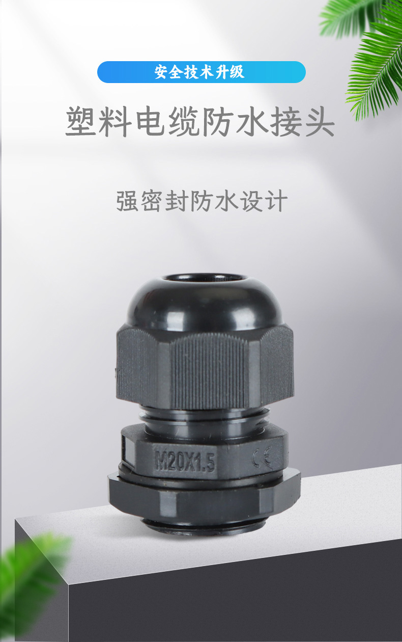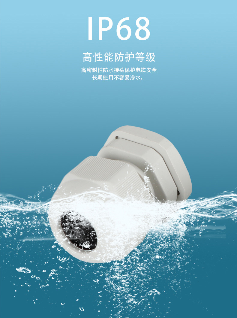 尼龍材質適用惡劣環境紅、灰、黑、深灰、白、藍 六種顏色常規:黑、灰兩種顏色,其它顏色需要定做在嚴寒與高溫等惡劣環境下,保持長期不開裂不漏水高密封性防水接頭保護電纜安全,長期使用不容易滲水