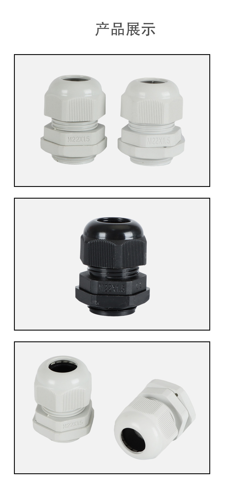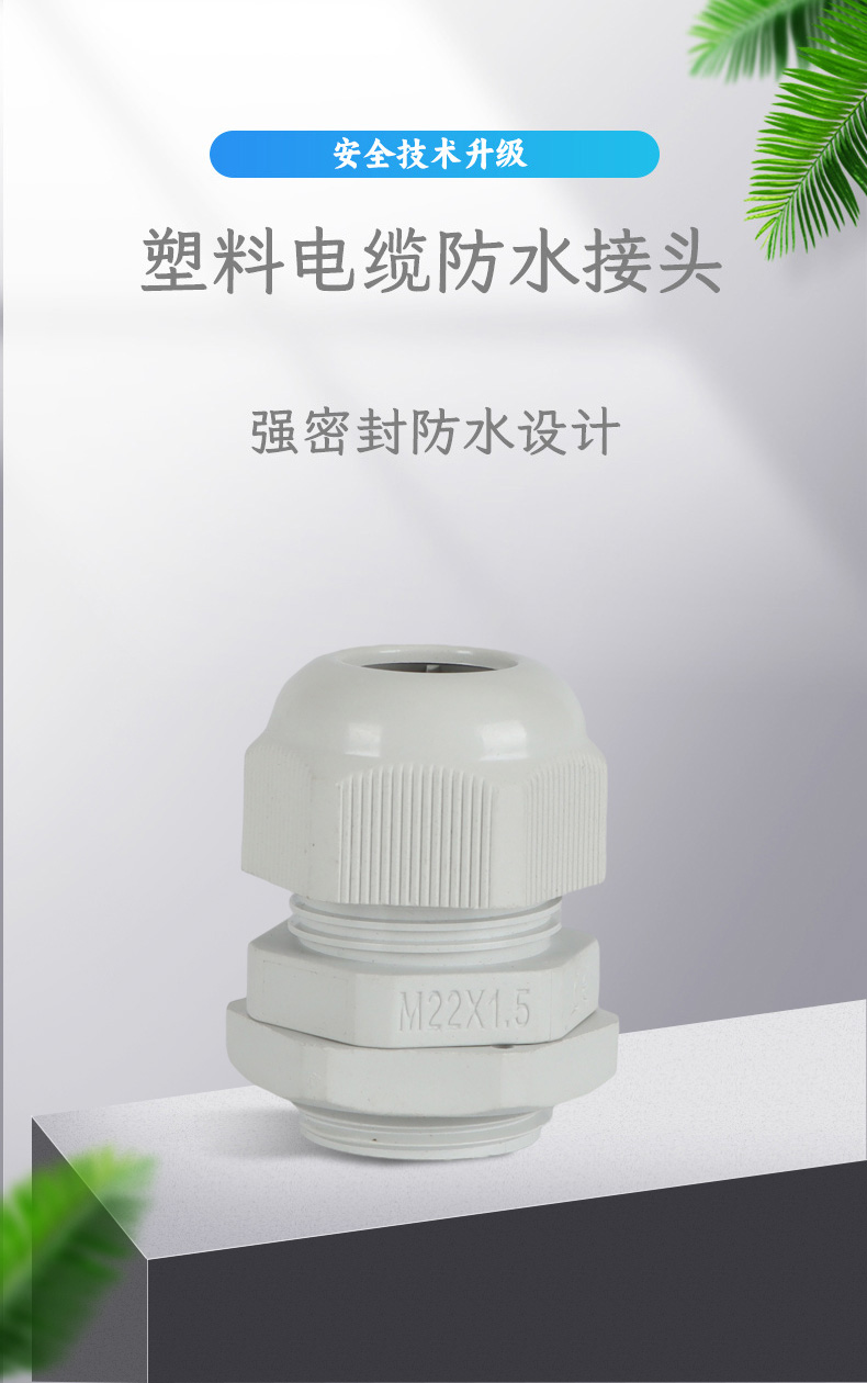 尼龍材質(zhì)適用惡劣環(huán)境紅、灰、黑、深灰、白、藍(lán) 六種顏色常規(guī):黑、灰兩種顏色,其它顏色需要定做在嚴(yán)寒與高溫等惡劣環(huán)境下,保持長(zhǎng)期不開(kāi)裂不漏水高密封性防水接頭保護(hù)電纜安全,長(zhǎng)期使用不容易滲水