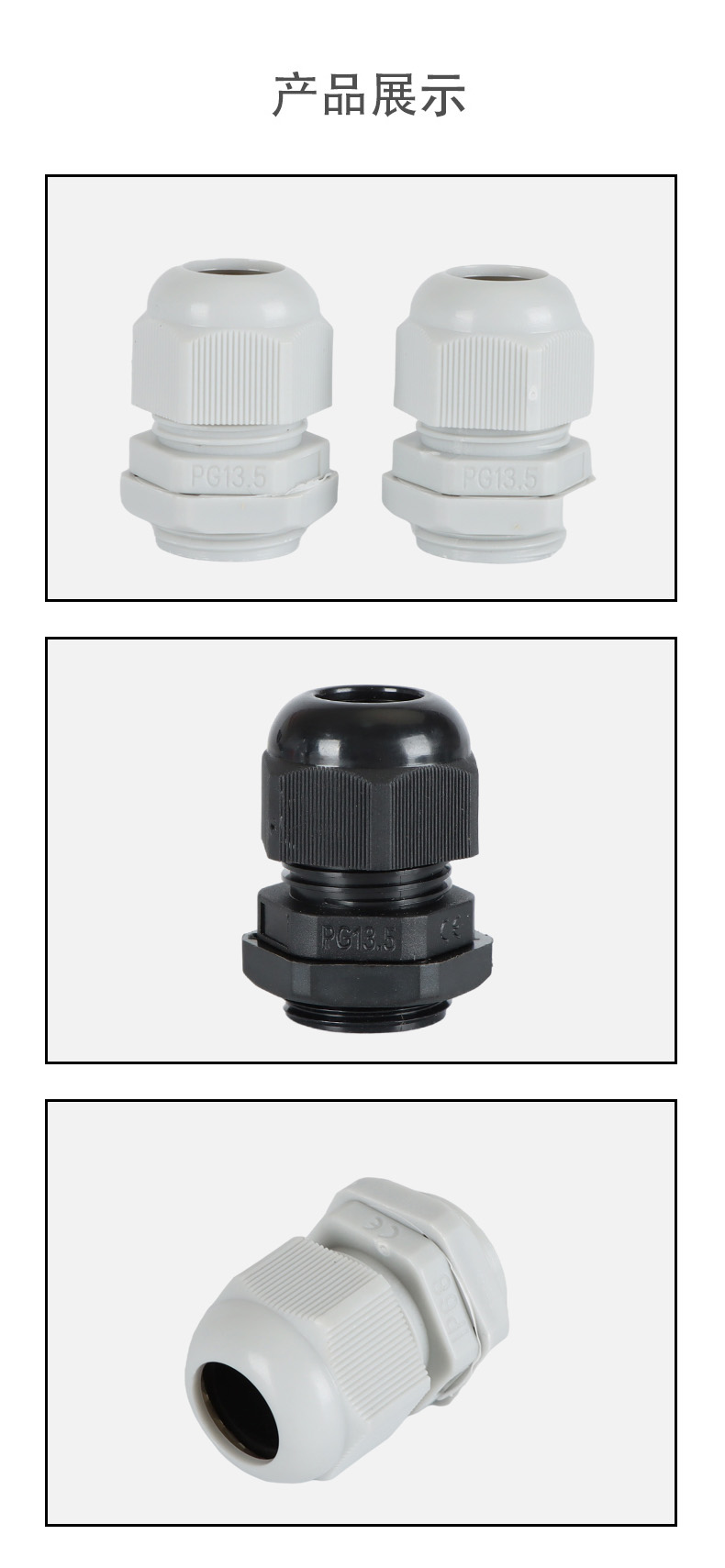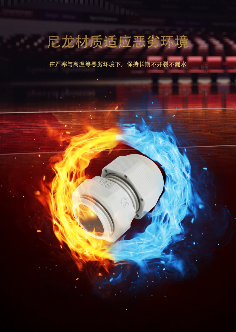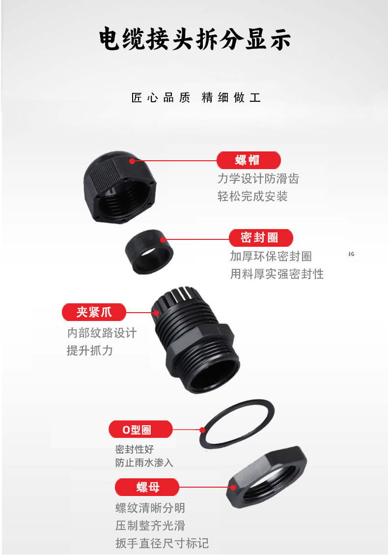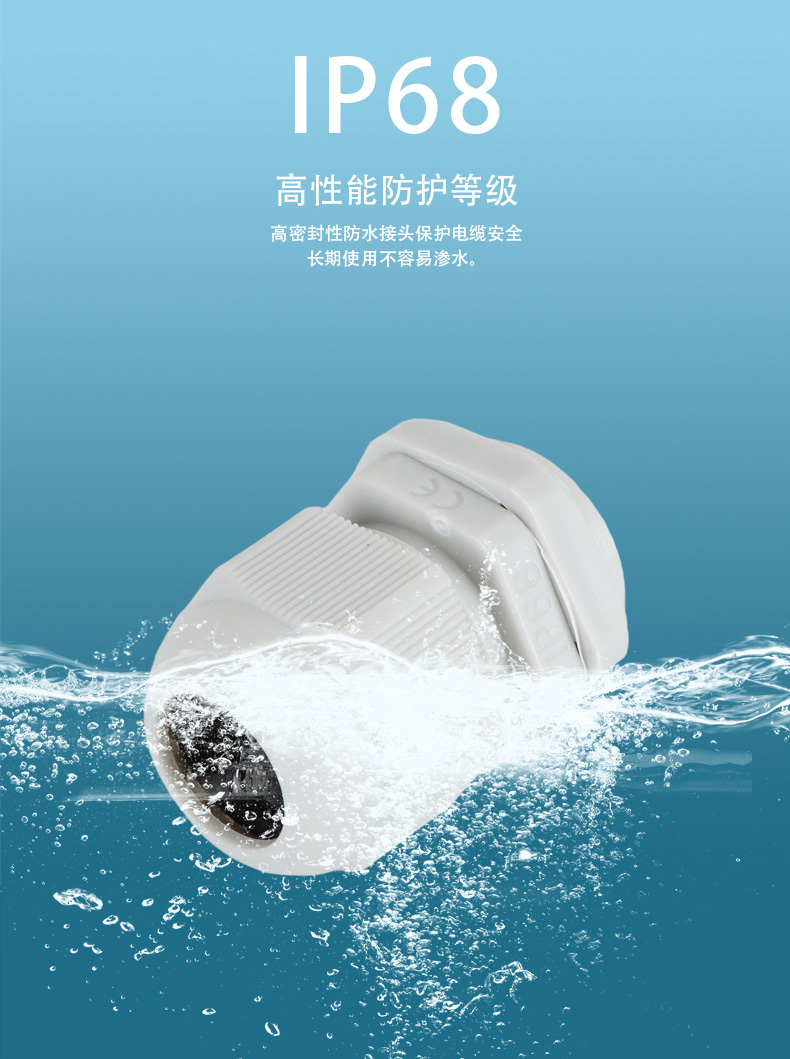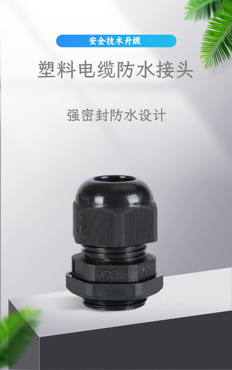 尼龍材質適用惡劣環境紅、灰、黑、深灰、白、藍 六種顏色常規:黑、灰兩種顏色,其它顏色需要定做在嚴寒與高溫等惡劣環境下,保持長期不開裂不漏水高密封性防水接頭保護電纜安全,長期使用不容易滲水