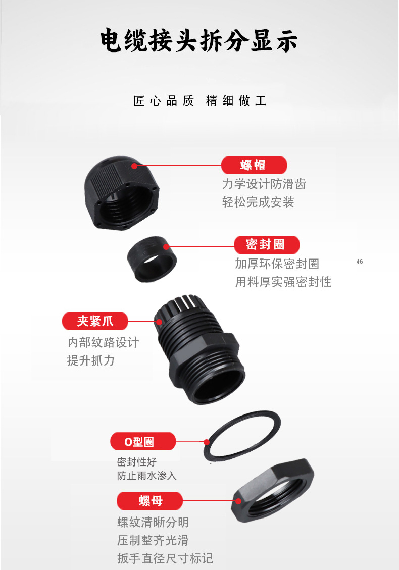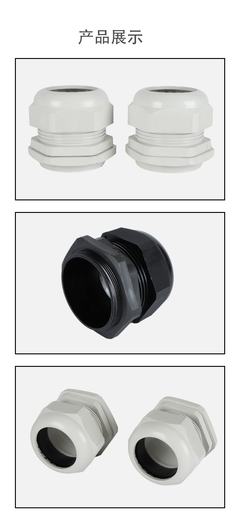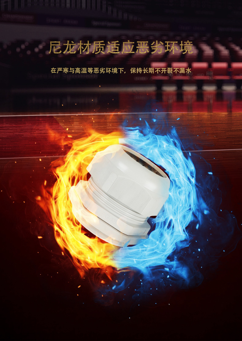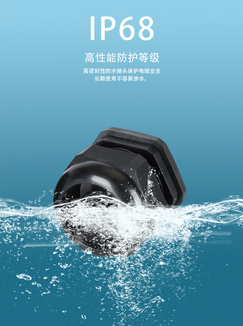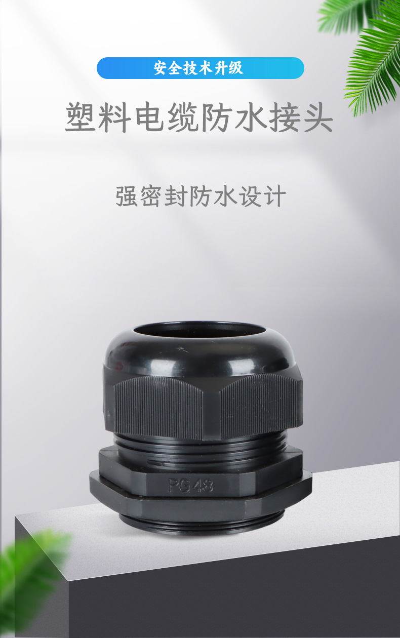 尼龍材質適用惡劣環境紅、灰、黑、深灰、白、藍 六種顏色常規:黑、灰兩種顏色,其它顏色需要定做在嚴寒與高溫等惡劣環境下,保持長期不開裂不漏水高密封性防水接頭保護電纜安全,長期使用不容易滲水