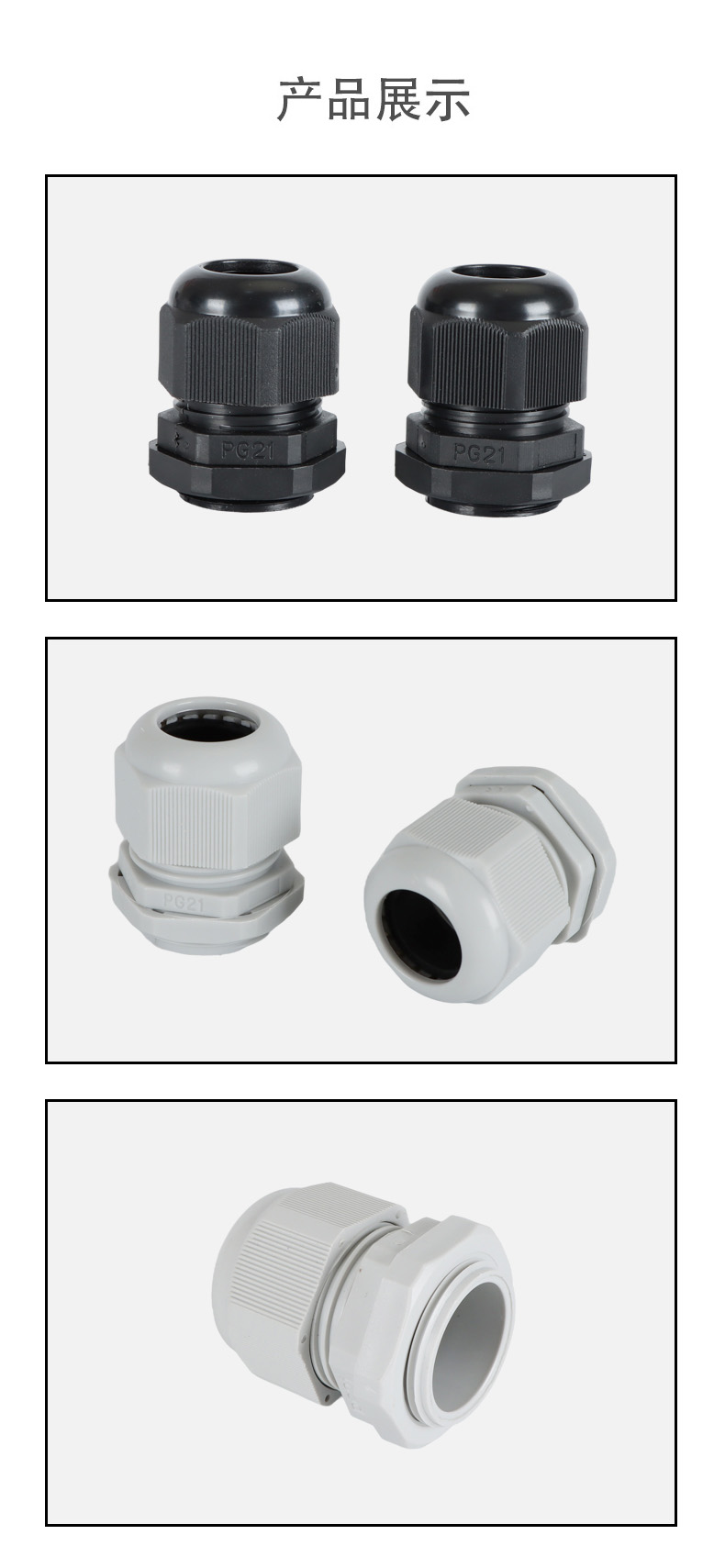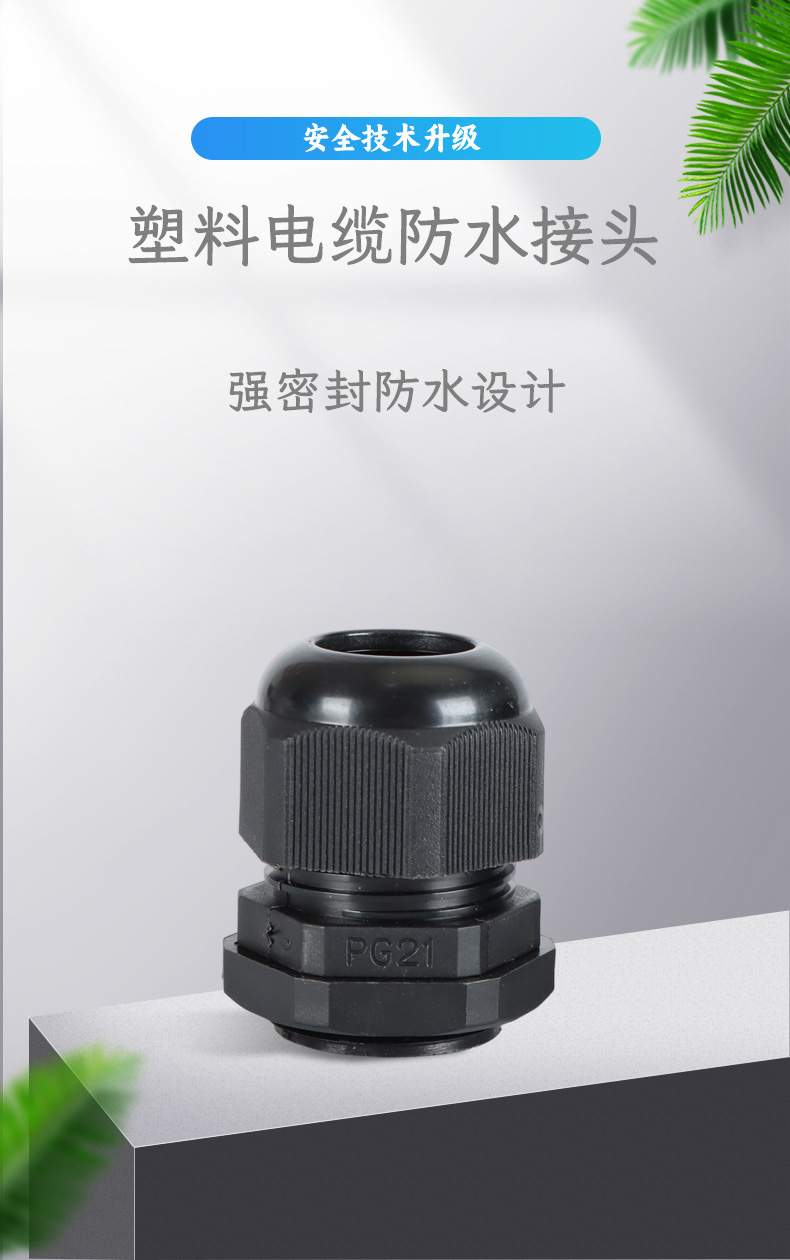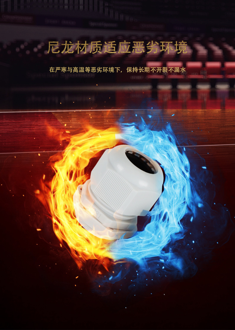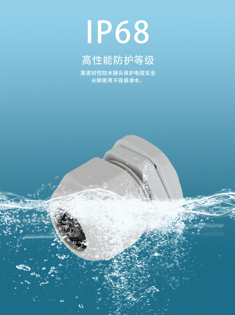 尼龍材質適用惡劣環境紅、灰、黑、深灰、白、藍 六種顏色常規:黑、灰兩種顏色,其它顏色需要定做在嚴寒與高溫等惡劣環境下,保持長期不開裂不漏水高密封性防水接頭保護電纜安全,長期使用不容易滲水