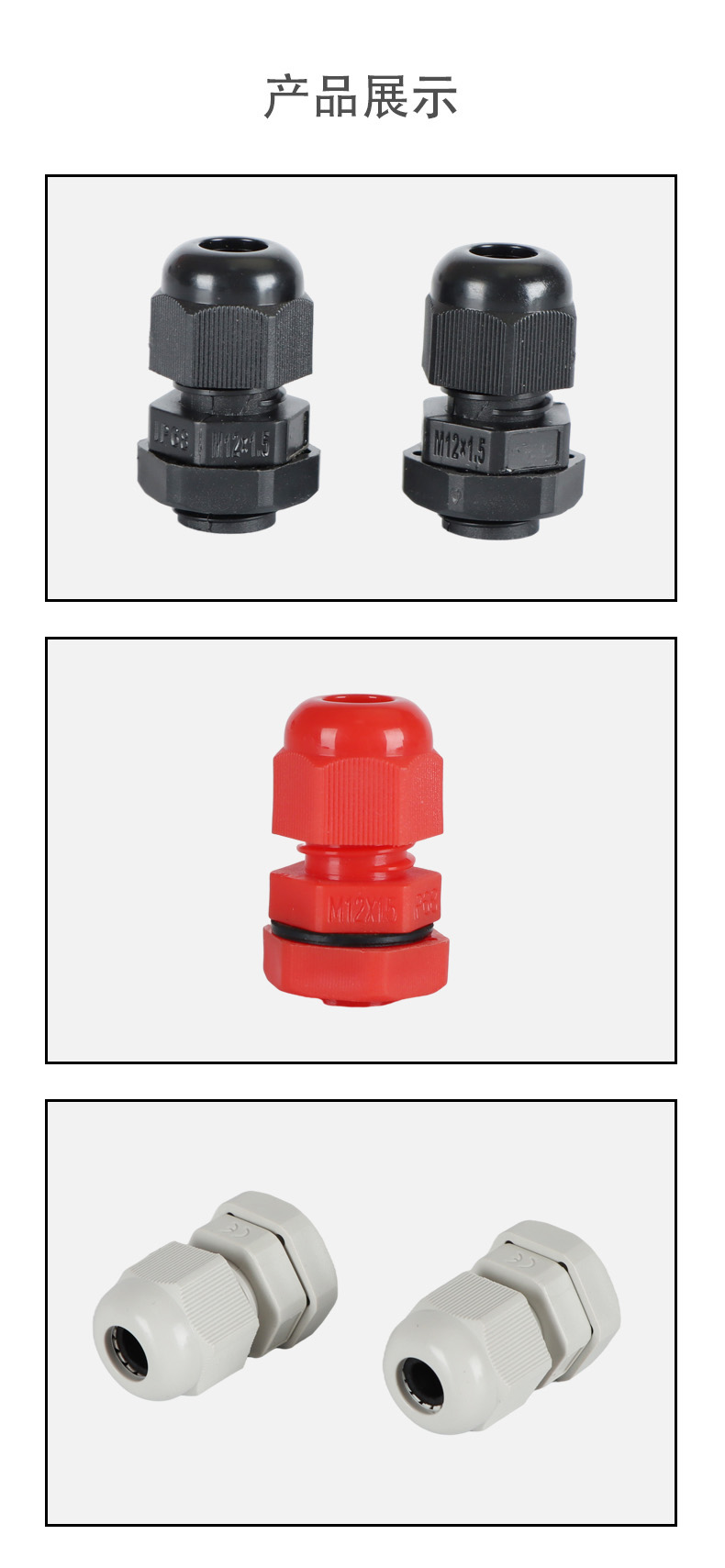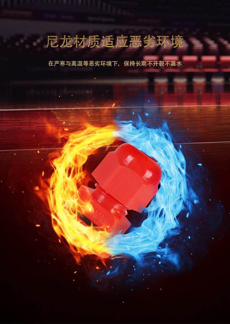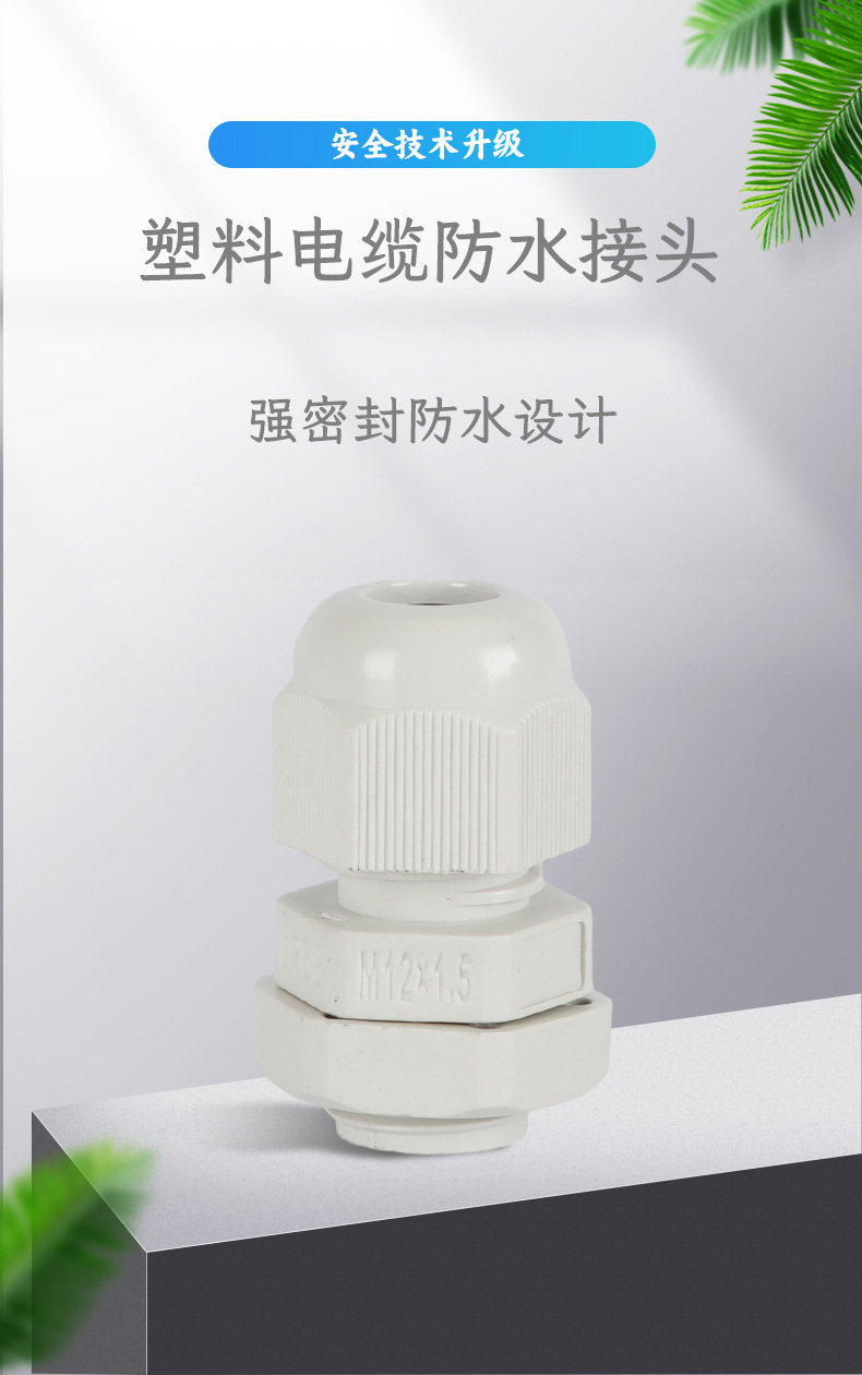 尼龍材質適用惡劣環境紅、灰、黑、深灰、白、藍 六種顏色常規:黑、灰兩種顏色,其它顏色需要定做在嚴寒與高溫等惡劣環境下,保持長期不開裂不漏水高密封性防水接頭保護電纜安全,長期使用不容易滲水
