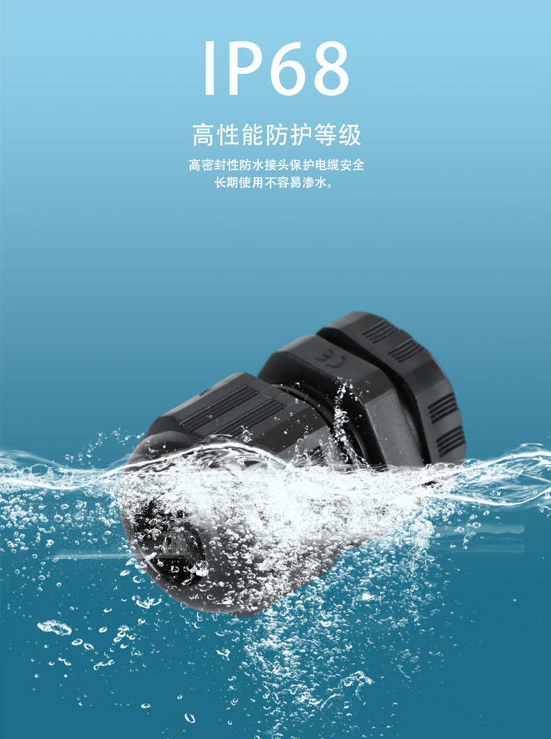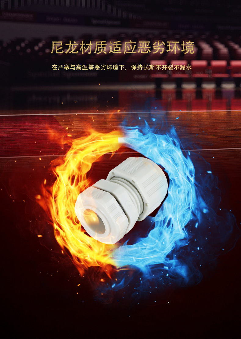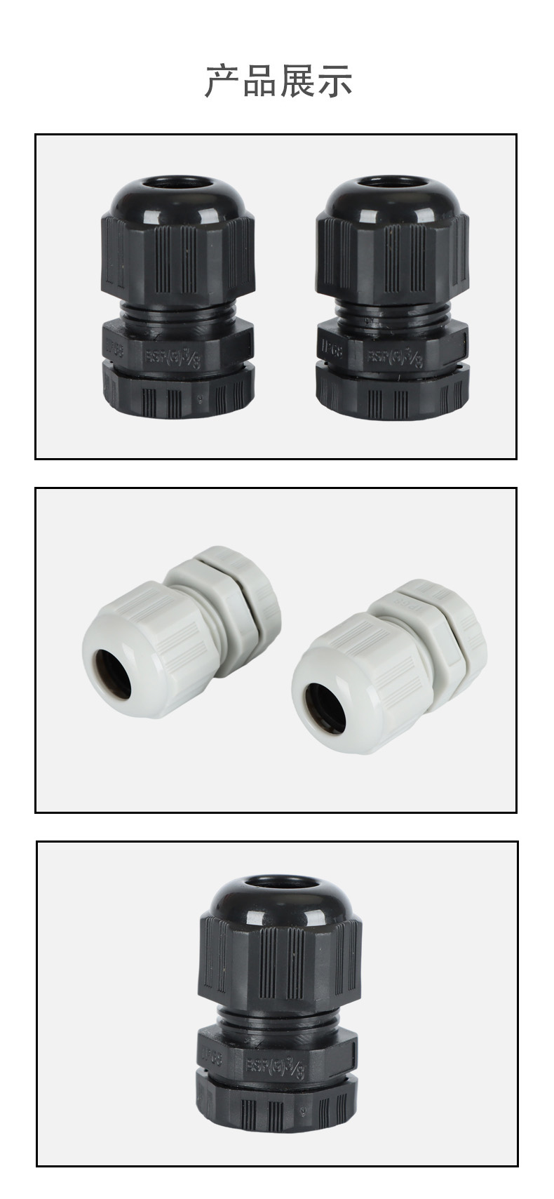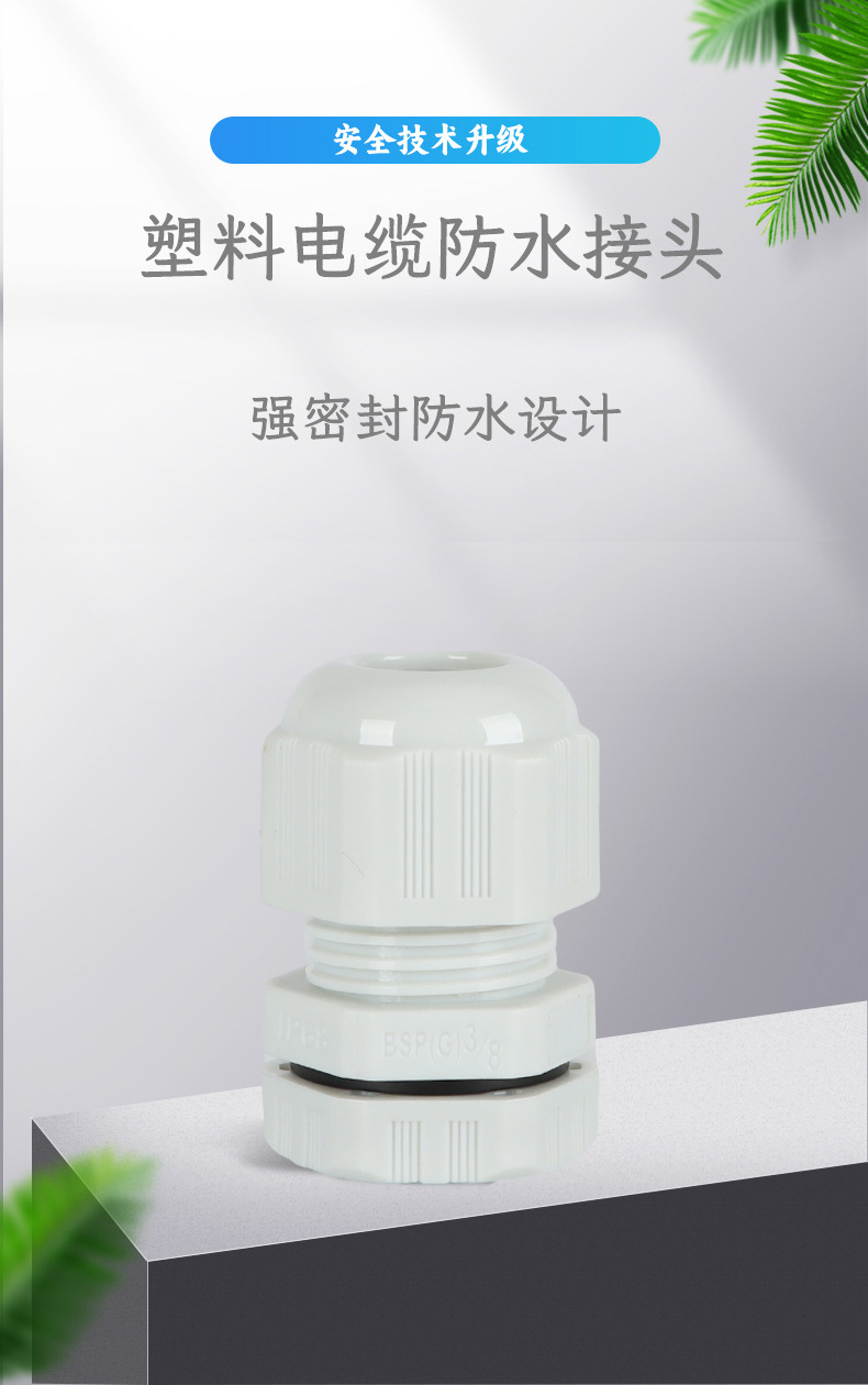 尼龍材質適用惡劣環境紅、灰、黑、深灰、白、藍 六種顏色常規:黑、灰兩種顏色,其它顏色需要定做在嚴寒與高溫等惡劣環境下,保持長期不開裂不漏水高密封性防水接頭保護電纜安全,長期使用不容易滲水